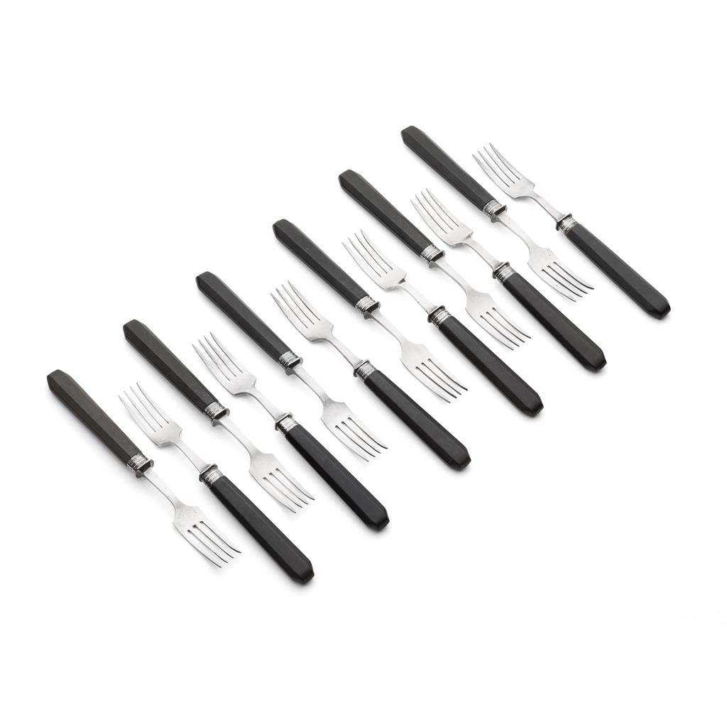 electroplated metal and stained bone, each with four prongs and faceted handles, impressed marks MISS CRANSTON’S (12)