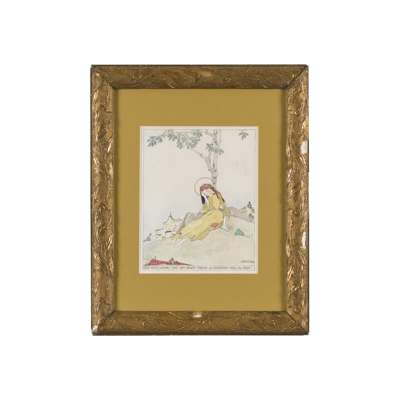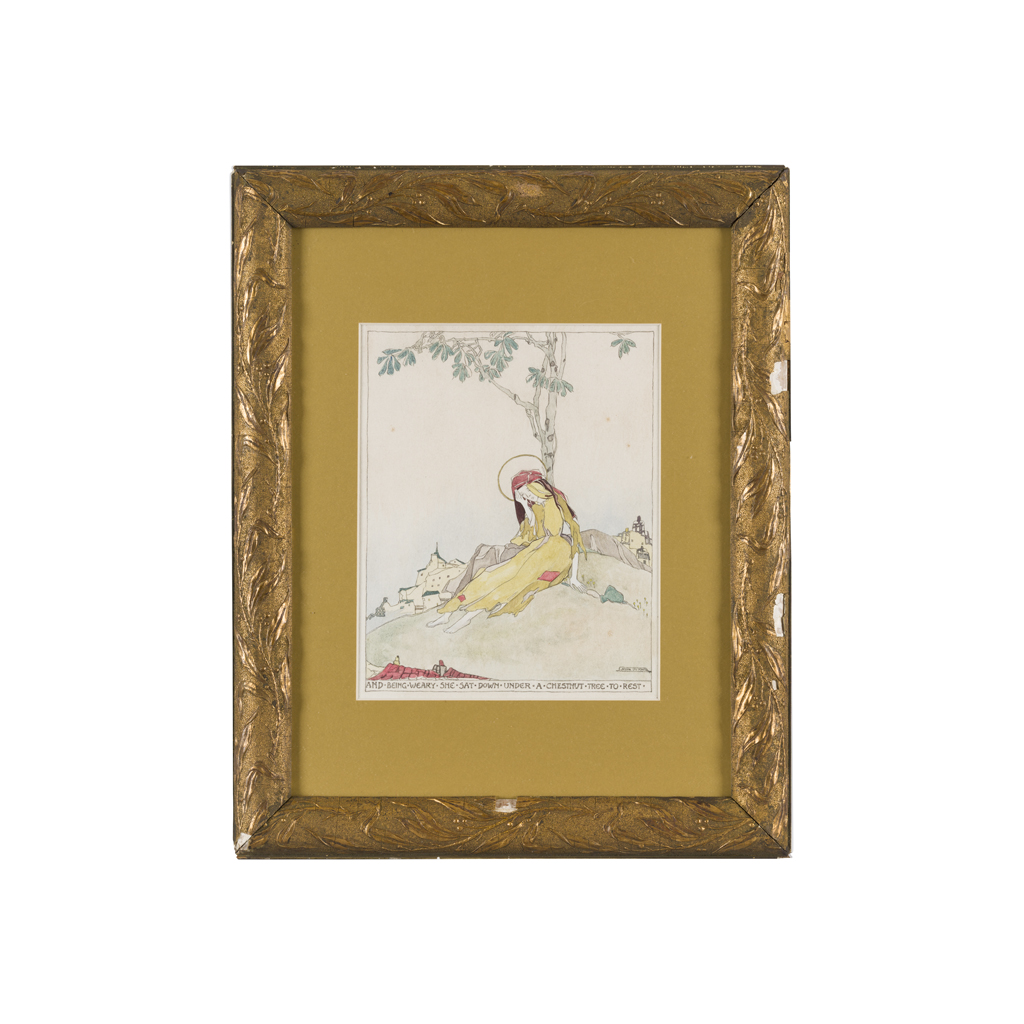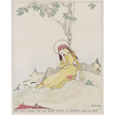 pen and ink and watercolour, signed lower right JESSIE M. KING and bearing inscription AND BEING WEARY SHE SAT DOWN UNDER A CHESTNUT TREE TO REST