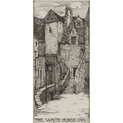 pen and ink on vellum, signed and inscribed JESSIE M KING/ THE WHITE HORSE INN