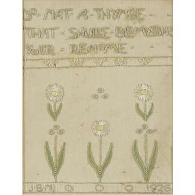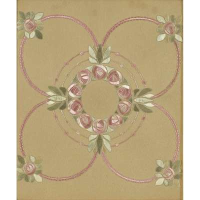embroidered in coloured threads on a buff felt ground with stylised roses, 43cm x 35cm; and TWO FURTHER GLASGOW STYLE EMBROIDERED PANELS, one embroidered with daisies and bearing embroidered inscription DO NAT A THYNGE THAT SHULDE BLEMYSSHE YOUR RENOME and signed and dated J.B.N/ 1926, 19.5cm x 15cm; the other a tea cosy, embroidered with flowers, 18cm x 25cm (3)