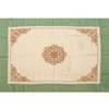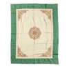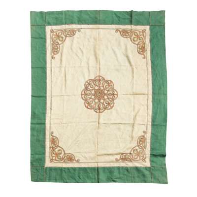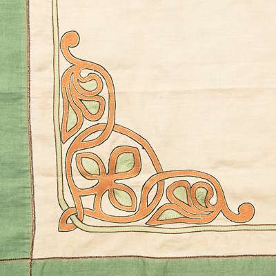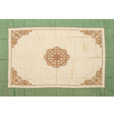 embroidered in coloured threads with elaborate Celtic knotwork and leaf design and reserved on unbleached linen with green linen border