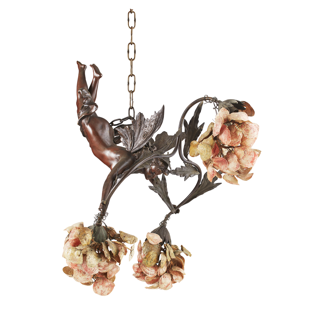 cast as a winged maiden, supporting three branches for electricity, later shell shades