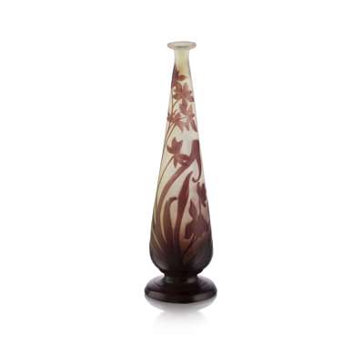 of slender tapering form, the frosted glass body overlaid with amethyst glass and etched with flowers, cameo signature GALLÉ