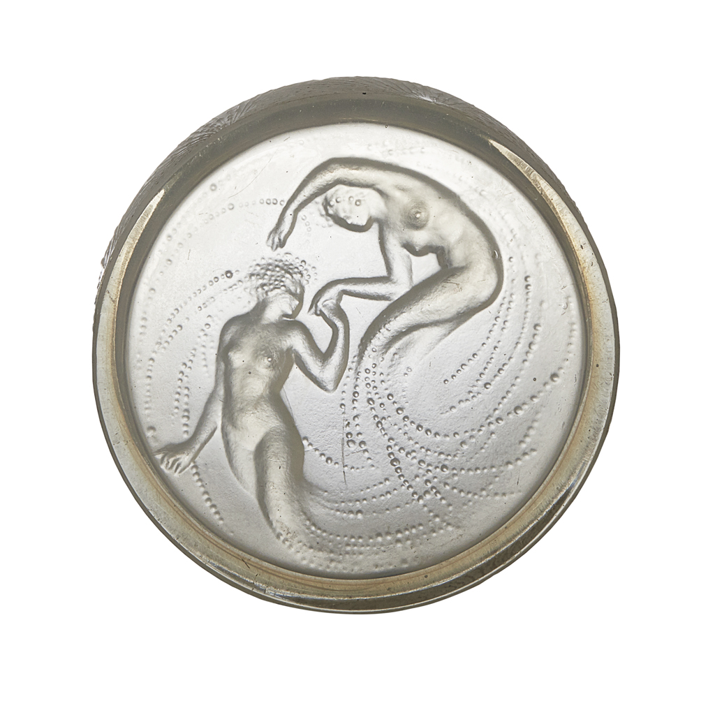 'DEUX SIRENES' FROSTED AND OPALESCENT GLASS POWDER BOX, CIRCA 1921