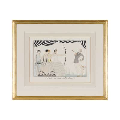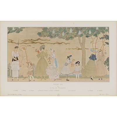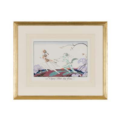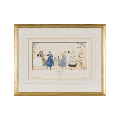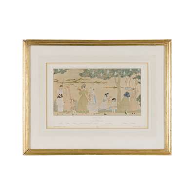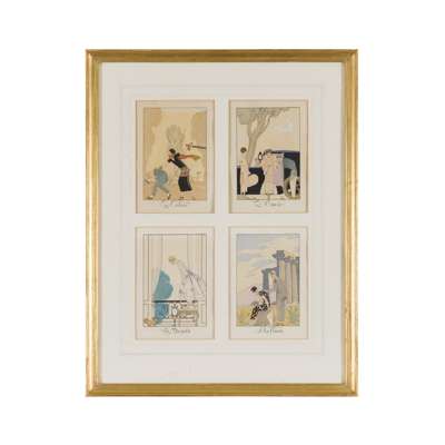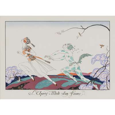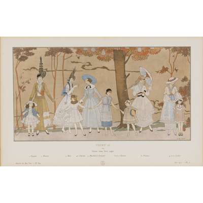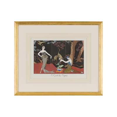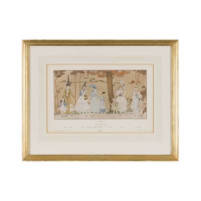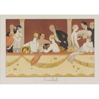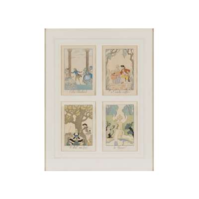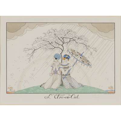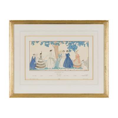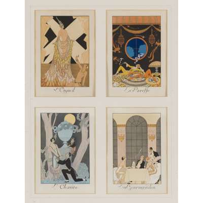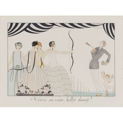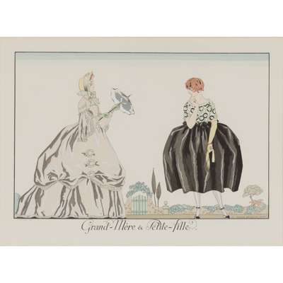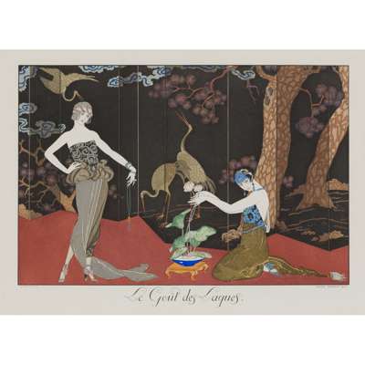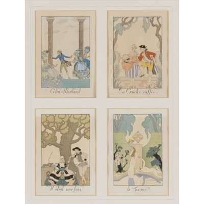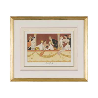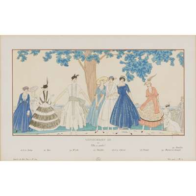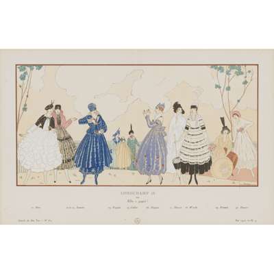 Note: George Barbier was one of the great French illustrators of the 20th century. His work epitomised the Art Deco period and embraced theatre and ballet costume design, jewellery, glass and fabrics as well as illustrations of haut couture costumes and books. Another leading illustrator working in Paris at the same time was Georges Lepape, and examples of his work are also included in this lot.