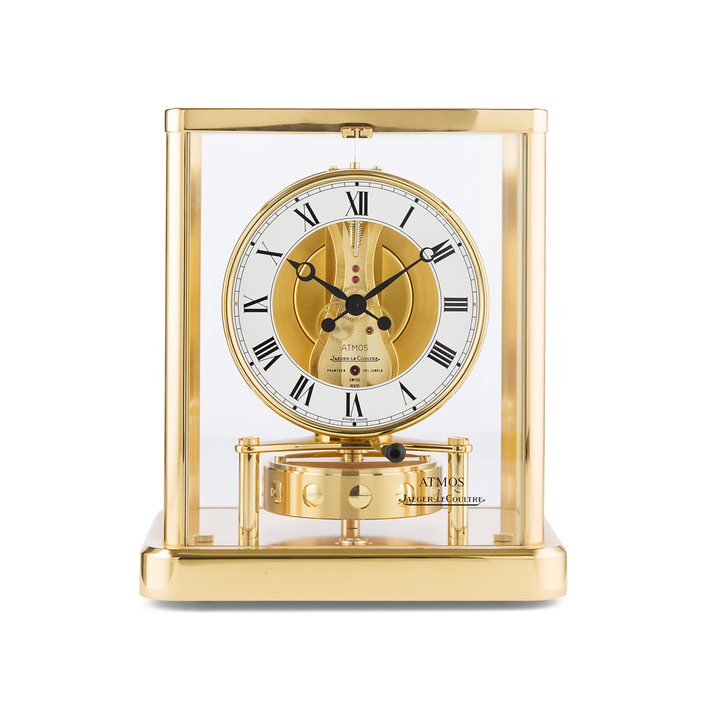 the circular dial with Roman chapters and black enamelled hands, the movement of typical form, within glazed case, signed ATMOS/ JAEGER LE COULTRE