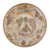 the unglazed surface incised and painted with the holy family to the centre enclosed by a band of angels, incised maker's marks and inscription DONE BY HAROLD/ RATHBONE/ CENTRE/ AFTER SANDRO/ BOTTICHELLI(SIC)/ 1902/ MADE AT THE/ "DELLA ROBBIA" POTTERY/ BIRKENHEAD