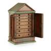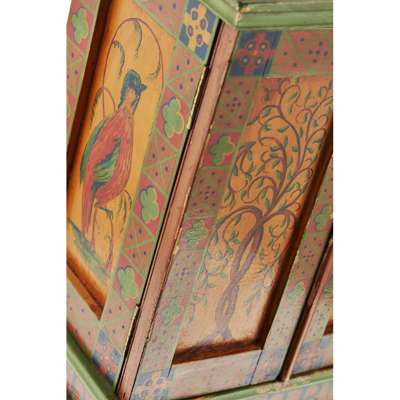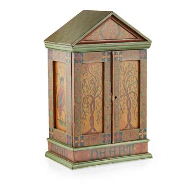 the pitched pediment with painted initials PA, above two doors opening to seven graduated drawers, painted with entwined trees, exotic birds, a sun motif and the inscription HAND/ HEART/ SOUL