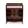 the raised spindled gallery with shaped shelf and inset embossed copper panel bearing inscription VITA SINE LITEREIS MORS EST (Life without literature is death), above two glazed and leaded doors flanked by adjustable open shelves and raised on square tapered legs, stamped maker's marks