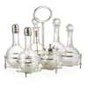 with ring handle, enclosing three glass bottles with stoppers; a salt and pepper pot and a mustard pot, glass mustard pot, pepper pot and salt, stamped maker's marks H&H/ 2881