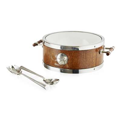 OAK AND SILVER PLATE-MOUNTED SALAD BOWL AND SERVERS, CIRCA 1880