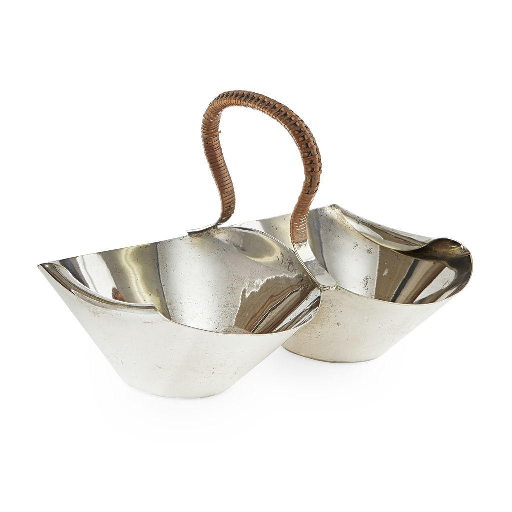 with two conjoined ovoid dished centred by a woven wicker-covered loop handle, stamped maker's marks H&H/ 2223/ DESIGNED BY DR. C DRESSER