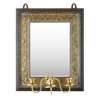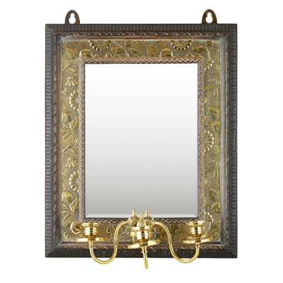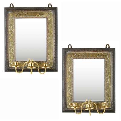 each with bevelled plates enclosed by embossed brass and carved wood frames and with three applied and hinged scrolling candle arms (2)