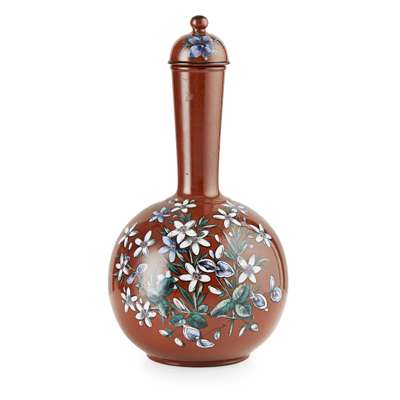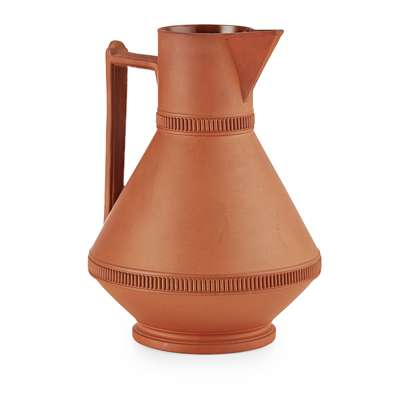 comprising an OLD HALL CERAMIC JUG, 19cm high; an OLD HALL SQUARE CERAMIC PLATE, 22.5cm diameter; a WATCOMBE TERRACOTTA JUG, 17.5cm high, each with maker's marks; and a WATCOMBE GLAZED TERRACOTTA VASE & COVER, printed and painted in enamels with flowers, unmarked, 29cm high (4)