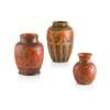 each covered in a mottled orange glaze, one moulded with a frieze of lions, bear incised signature R. JOYCE, 21cm high; another moulded with fish, bears incised artist's monogram, 14.5cm high; and another moulded with a frieze of lions, 24cm high, each with impressed maker's marks (3)