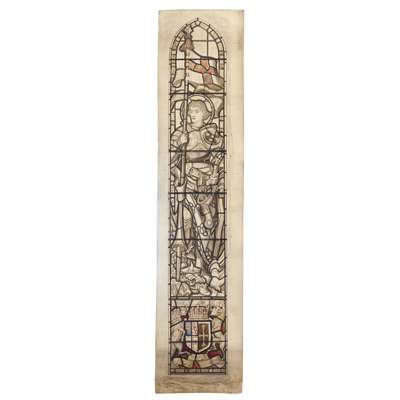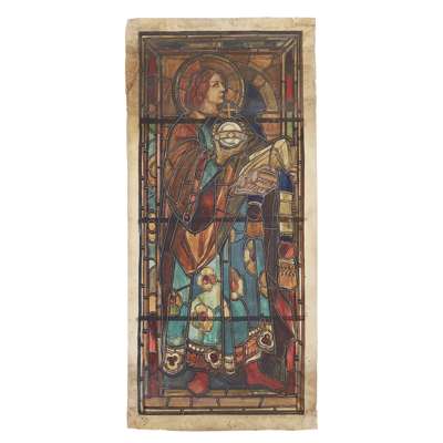 13. 53cm x 112cm, inscribed 'H. J. Salisbury , Artist in Stained Glass, 18 John Street, Bedford row, London, W.C. and St. Albans. St. Luke.'