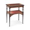 the rectangular hinged top inlaid with ivory in a foliate design, opening to reveal an inset baize surface for cards, raised above a lower tier, supported by turned and blocked legs with incised gilt embellishments