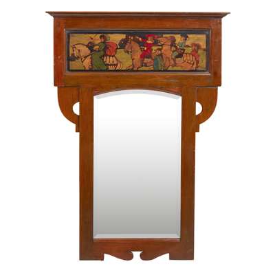 with stencilled polychrome panel depicting a hunting scene, above a bevelled plate and shaped frame