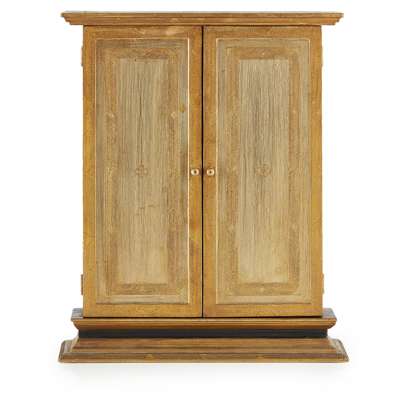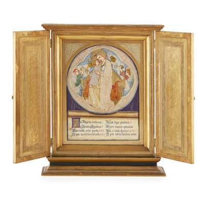 depicting the Virgin & Child with attendant angels, with illuminated inscription AVE REGINA COELORUM....ET PRO NOBIS CHRISTUM EXORS, within gilt painted case and stand with twin doors