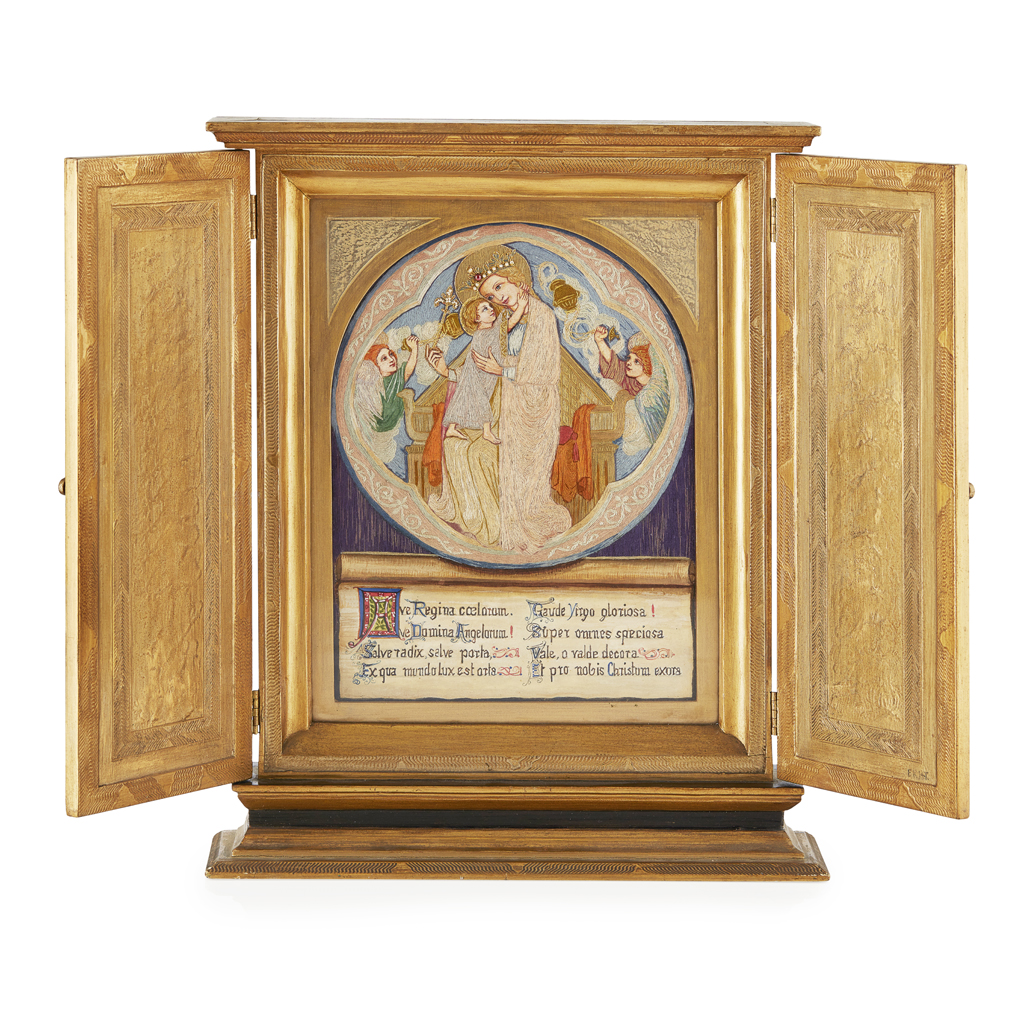 ARTS & CRAFTS PAINTED AND EMBROIDERED DEVOTIONAL PANEL, CIRCA 1900