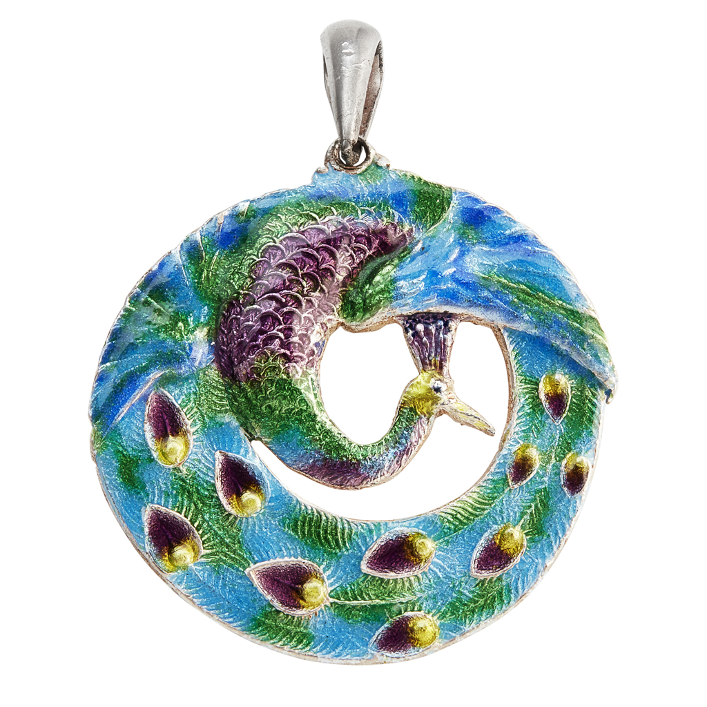 of pierced circular form, designed as a peacock and set with polychrome enamels, stamped maker's marks W.H.H., hallmarked Birmingham 1908