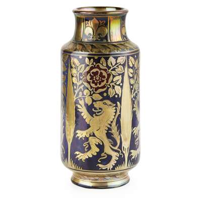 decorated with panels of lions rampant and flowering roses spaced with cypress trees, impressed maker's marks ROYAL LANCASTRIAN/ 3041/ ENGLAND, and with painted artist's monogram and dated 1917