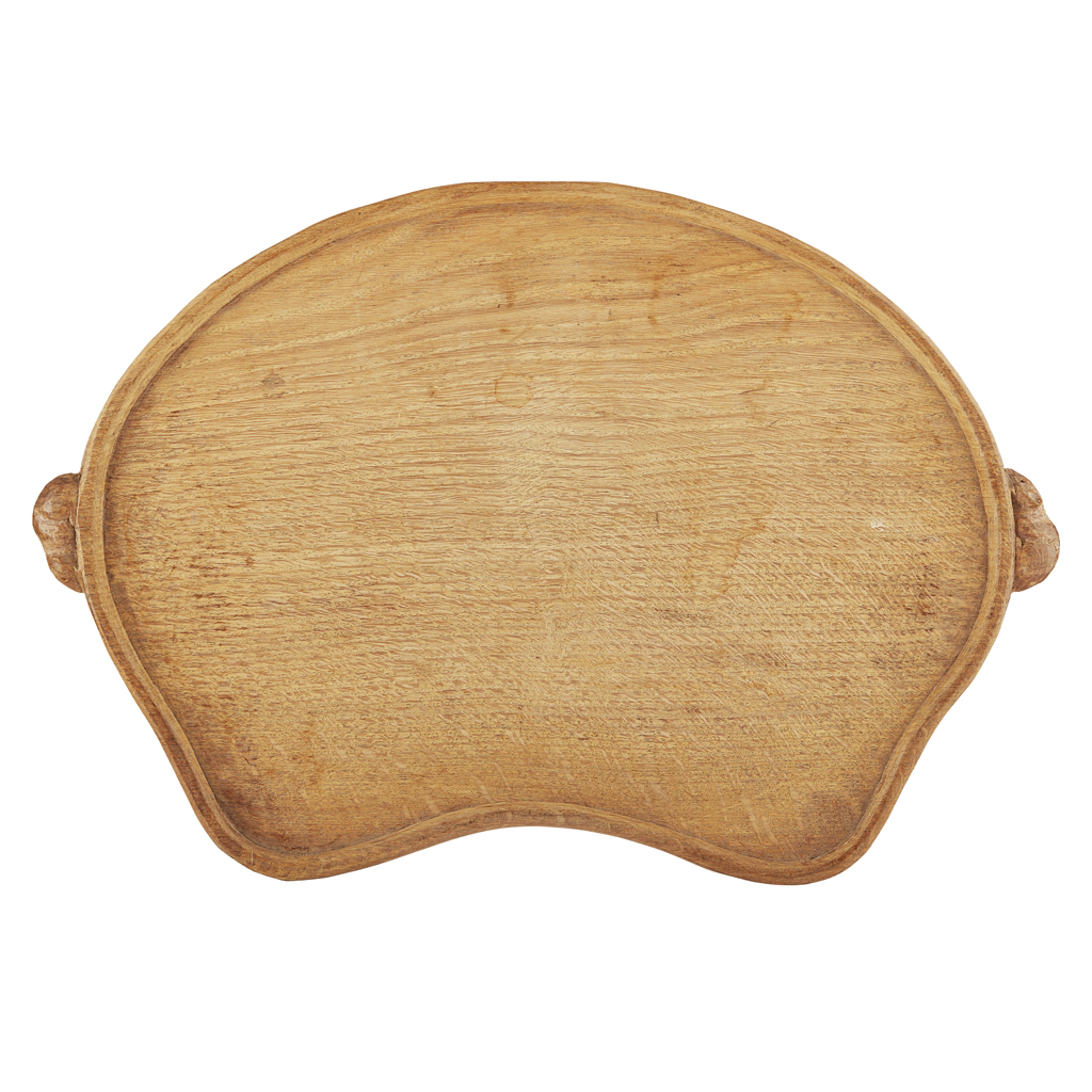 of kidney outline, the galleried tray with adzed surface and with two carved mouse signatures to the rim