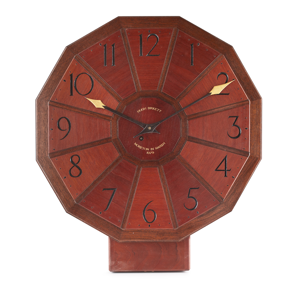 Note: Hugh Birkett learned much of his craft working with Oliver Morel, the furniture maker, teacher and farmer, at his farm in Herefordshire in 1948. Morel had been a pupil of Edward Barnsley, who in turn had trained with his father Sidney Barnsley and Ernest Gimson at Sapperton. He moved to Morton-in-Marsh in 1966, where this clock was made.