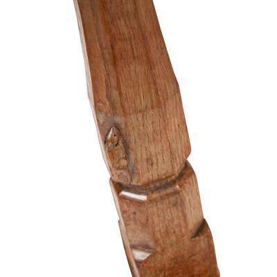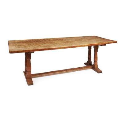 the rectangular planked top with adzed surface raised on four turned and faceted baluster legs on trestle bases linked by a stretcher, carved mouse signature