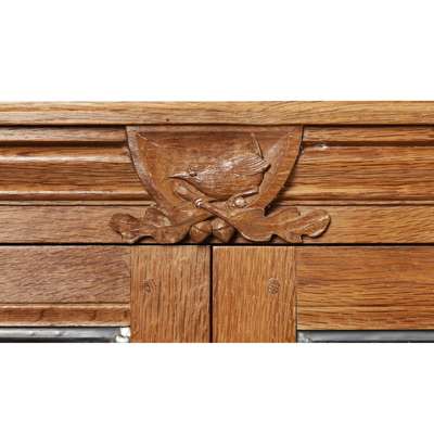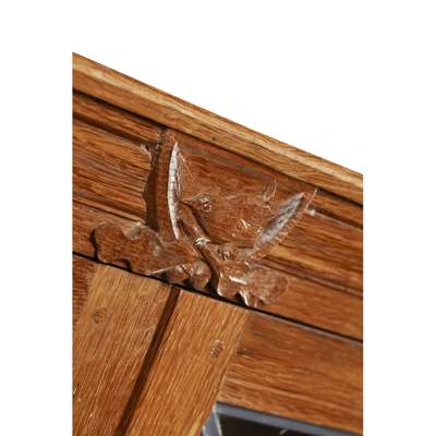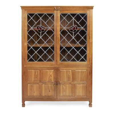 the moulded cornice above two stained and leaded glass doors with rose motifs above two further panelled doors raised on square feet, the cornice carved with wren and oak leaf signature