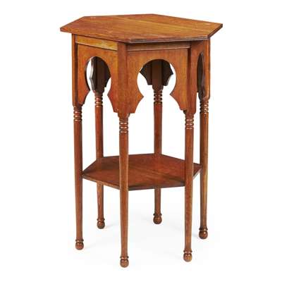 in the Moorish taste, the six-sided top above arcaded apron and ring turned legs uniting a lower tier