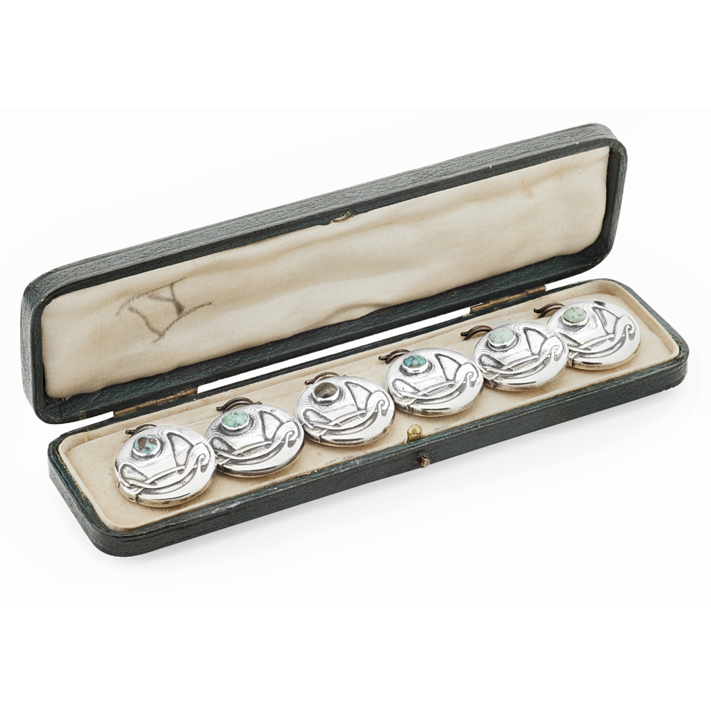 BOXED SET OF SIX 'CYMRIC' SILVER AND TURQUOISE BUTTONS, CIRCA 1906