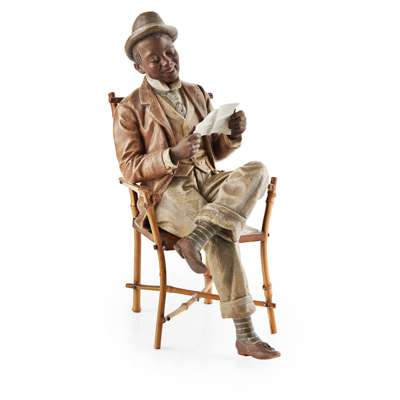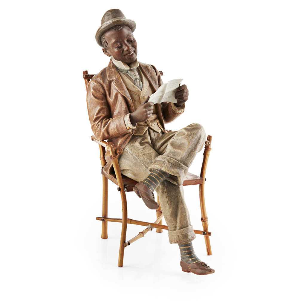 modelled by Haniroff as a young man reading a letter, the figure seated on a bamboo chair, impressed maker's marks FRIEDRICH GOLDSCHEIDER/ WIEN/ REPRODUCTION RESERVEE/ 1890/ 10/ 19, and bearing incised signature HANIROFF