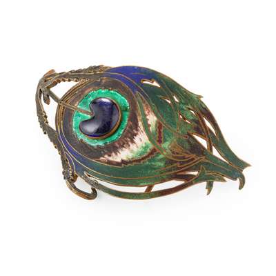 bronze and cloisonné enamel, modelled as a peacock's feather set with a blue glass cabochon, stamped with maker's marks PF/ DEPOSE