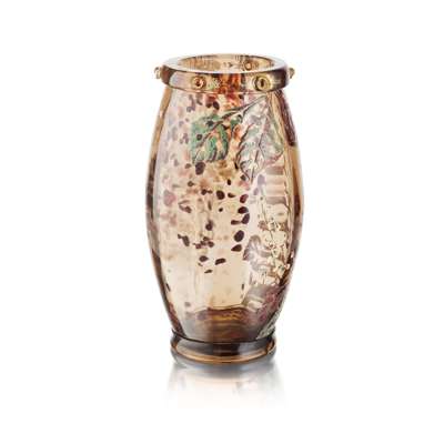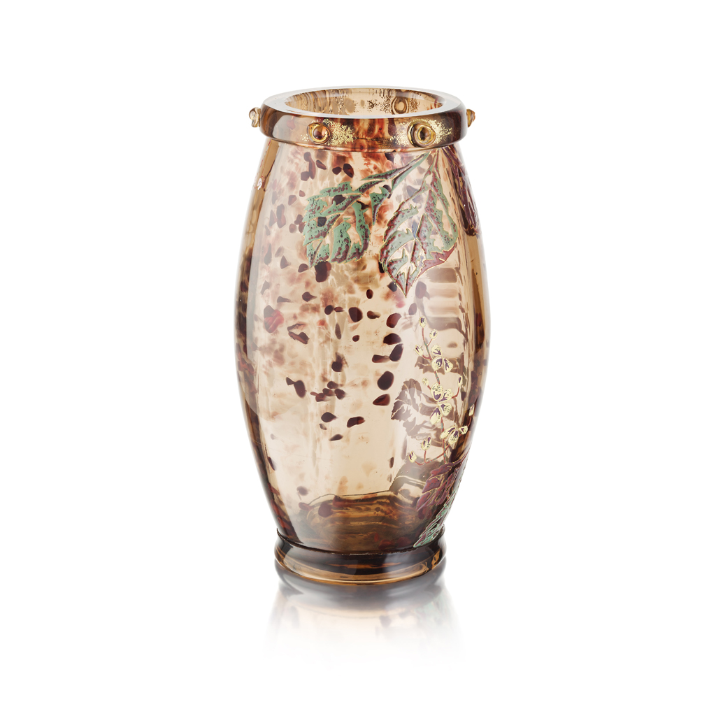 of swollen cylindrical for, the mottled body applied with coloured enamels highlighted with gilt, etched maker's mark to base E. GALLÉ