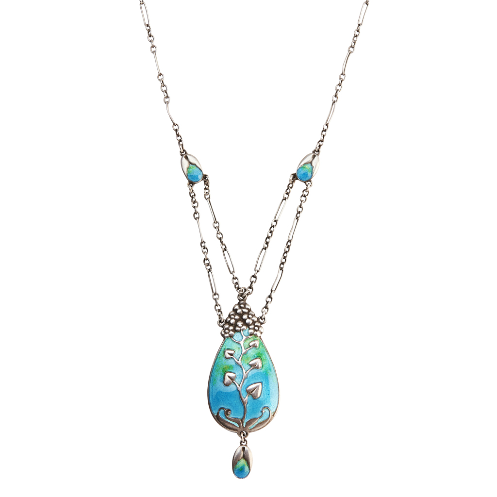 designed as a stylised tree of life, with oval drop pendant below and with fine link chain with corresponding enamel spacers, stamped maker's marks MB&Co/ 950
