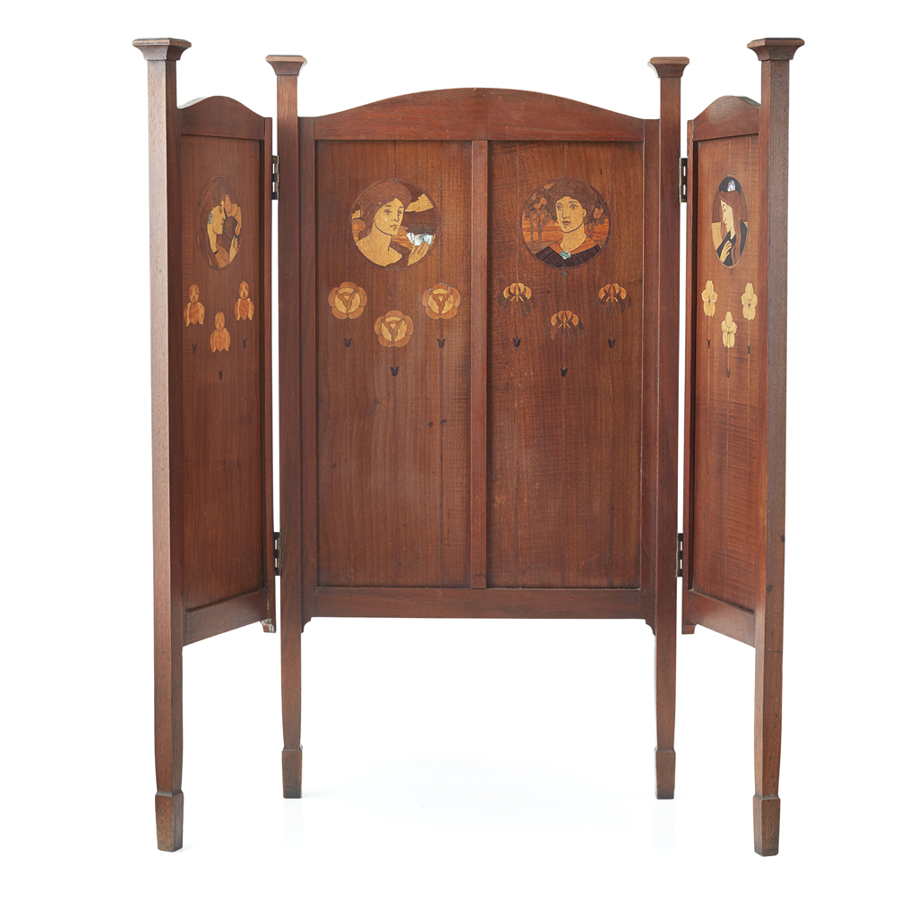 ART NOUVEAU MAHOGANY AND MARQUETRY TRIPTYCH FIRESCREEN, CIRCA 1900