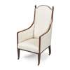 with upholstered back with turned finials enclosing upholstered arms and seat, raised on square tapered legs