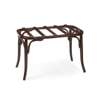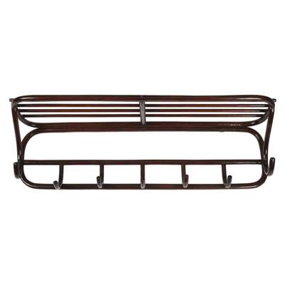 the slatted shelf above five coat pegs, 93cm wide, 26cm high, 28cm deep; and a FISCHEL BENTWOOD LUGGAGE TABLE, CIRCA 1900, the slatted top on circular section legs linked by stretchers, bears paper maker's label, 72cm wide, 47cm high, 42cm deep (2)