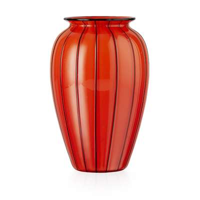 of tapering shouldered form, in orange glass with black striping