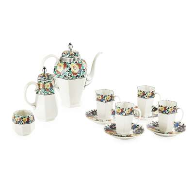 decorated by Lily (Phoebe) M. Blatherwick on Limoges blanks and comprising a COFFEE POT & COVER; CREAMER & COVER; SUGAR BOWL; and FOUR CUPS & SAUCERS, each with painted artist's marks L.M.P. with swastika symbol (11)