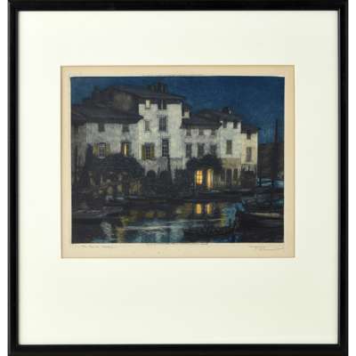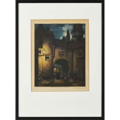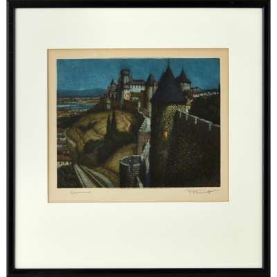 'BRUGES', 26cm x 18cm; 'CARCASSONNE', 20cm x 25cm; and another by the same hand, 20cm x 23cm, each inscribed and signed in pencil F. MARRIOTT, later framed and glazed (3)