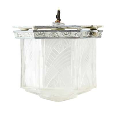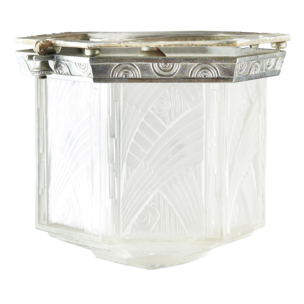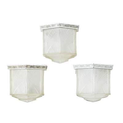 comprising TWO CEILING LIGHTS, 18.5cm diameter, 17.5cm high; and THREE WALL LIGHTS en suite, 18.5cm wide, 17.5cm high, each shade moulded with stylised foliate design, one ceiling light bears moulded maker's marks HETTIER & VINCENT/ FRANCE (5)
