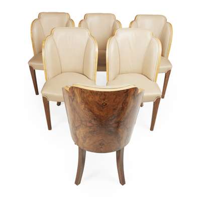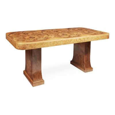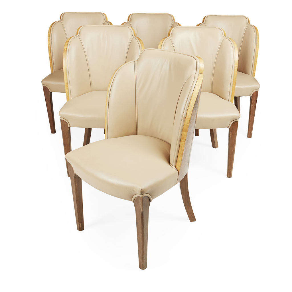 ART DECO FIGURED WALNUT DINING SUITE, CIRCA 1930