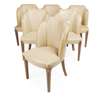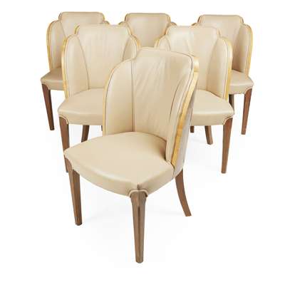 comprising a DINING TABLE, the rounded rectangular top with twin supports, 183cm long, 77cm high, 92cm deep; and SIX MATCHING DINING CHAIRS, each with 'cloud' shaped backs upholstered in Connolly leather and raised on tapering legs, 51cm wide, 90cm high, 45cm deep (7)