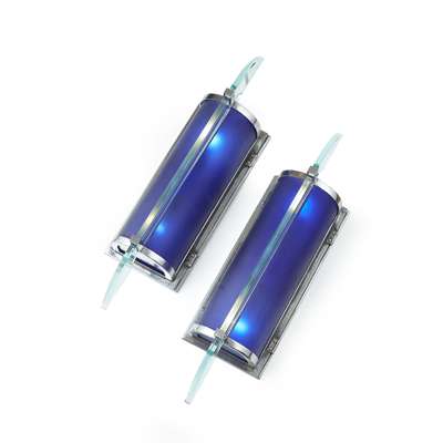 each of semi-circular section with curbed blue glass shades and clear etched glass fin decoration (2)