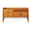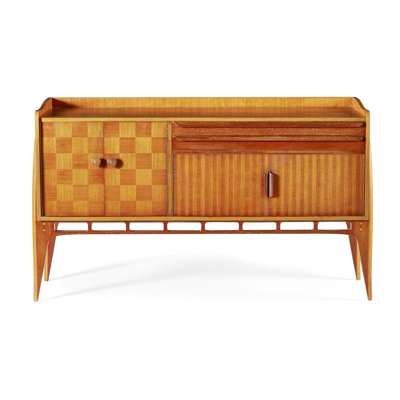 The manufacture of the Allegro suite also found its origins in wartime innovation. The Southampton-based manufacturer of helicopters, Cierva Autogiro, had developed techniques of laminating and shaping wood to make strong and light helicopter blades - these blades were supplied by Morris of Glasgow by 1946, and the same technology was applied to this remarkable suite of furniture soon afterwards. Over one hundred layers of wood were bonded together under high frequency electrical pressure with phenoformaldehyde, a synthetic resin. The wood is then shaped and carved to produce the chairs, table and sideboard. Whilst it is now acknowledged as a landmark in immediate Post-War British furniture design, the immense expense of this manufacturing process meant that it went into extremely limited production, and as a result examples are extremely rare. In 1950 a single chair was advertised at £31 18s 3d, at a time when the average British annual income was just £101.