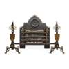 with brass mounts, the basket with lancet arched back, the dogs with applied shields engraved with initials EHA and set with leafy scrolled brackets and finials