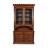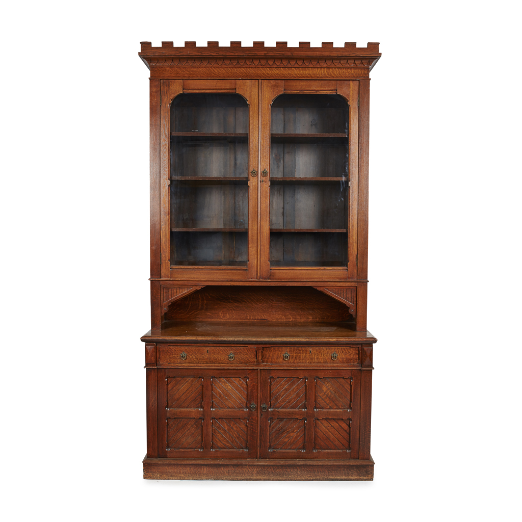 the projecting castellated cornice above two glazed doors enclosing adjustable shelves, the base with two drawers and two doors below, each with diagonal tongue and groove panels, plinth base