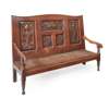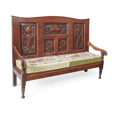 the arched back with fielded panels, each carved with flowers and foliage above open arms and a solid seat, with later squab cushions, raised on turned and blocked legs